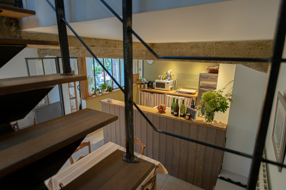 Cette salle spacieuse laissée à l’état brut avec sa verrière, ses anciennes mangeoires et ses poutres en béton, n’est pas sans rappeler l’esprit de campagne.