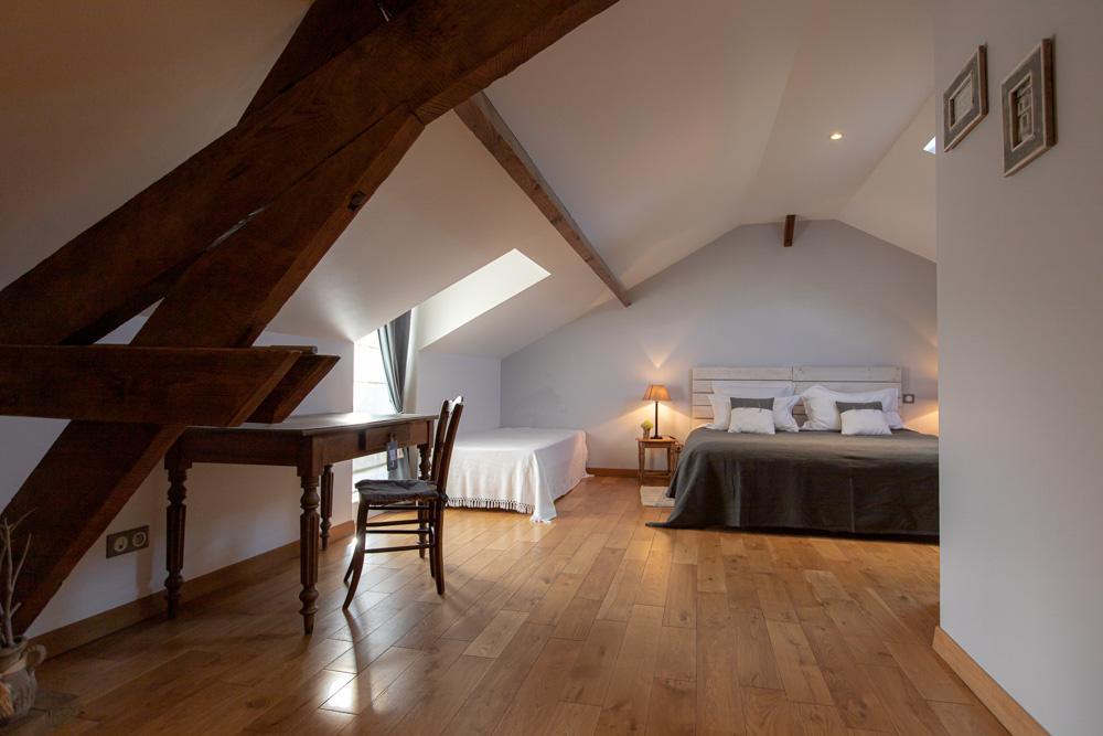 Placée dans les combles, elle bénéficie d’une atmosphère intimiste. La lucarne offre un puits de lumière naturelle agréable et donne un point de vue sur la cour permettant d’observer la vie de la ferme. Vous disposez d’une jolie salle de bain privative avec douche et toilettes. Vous avez aussi accès gratuitement à notre réseau wifi.